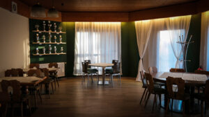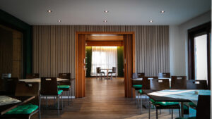 Zusätzlich hat die Gaststätte eine neue Optik erhalten: Mit frischer grüner Farbgestaltung, modernen Akustikpaneelen und neuen Vorhängen präsentiert sich der Raum insgesamt anders, moderner und neu.